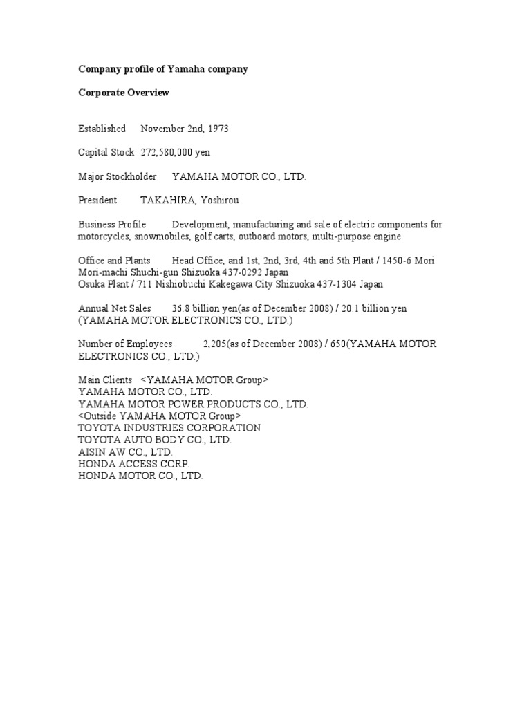 Company profile of yamaha company. Directors and audit & supervisory board members. Yamaha motor corporation is an automotive manufacturing company, specializing in motorcycles and outboard motors. The financial services segment covers the sales of the company's products. Yamaha motor brings pleasure to millions of people by using ingenuity and enthusiasm to constantly surpass customer my_yamaha profile logout. Logo licensing reprints/plaques spreadsheets custom profile. Yamaha motor australia was incorporated in june 1983, becoming part of a large international corporation with subsidiaries all over the world. Ever since our founder, genichi kawakami, established yamaha motor in 1955, it is our mission to give to all our customers kando.